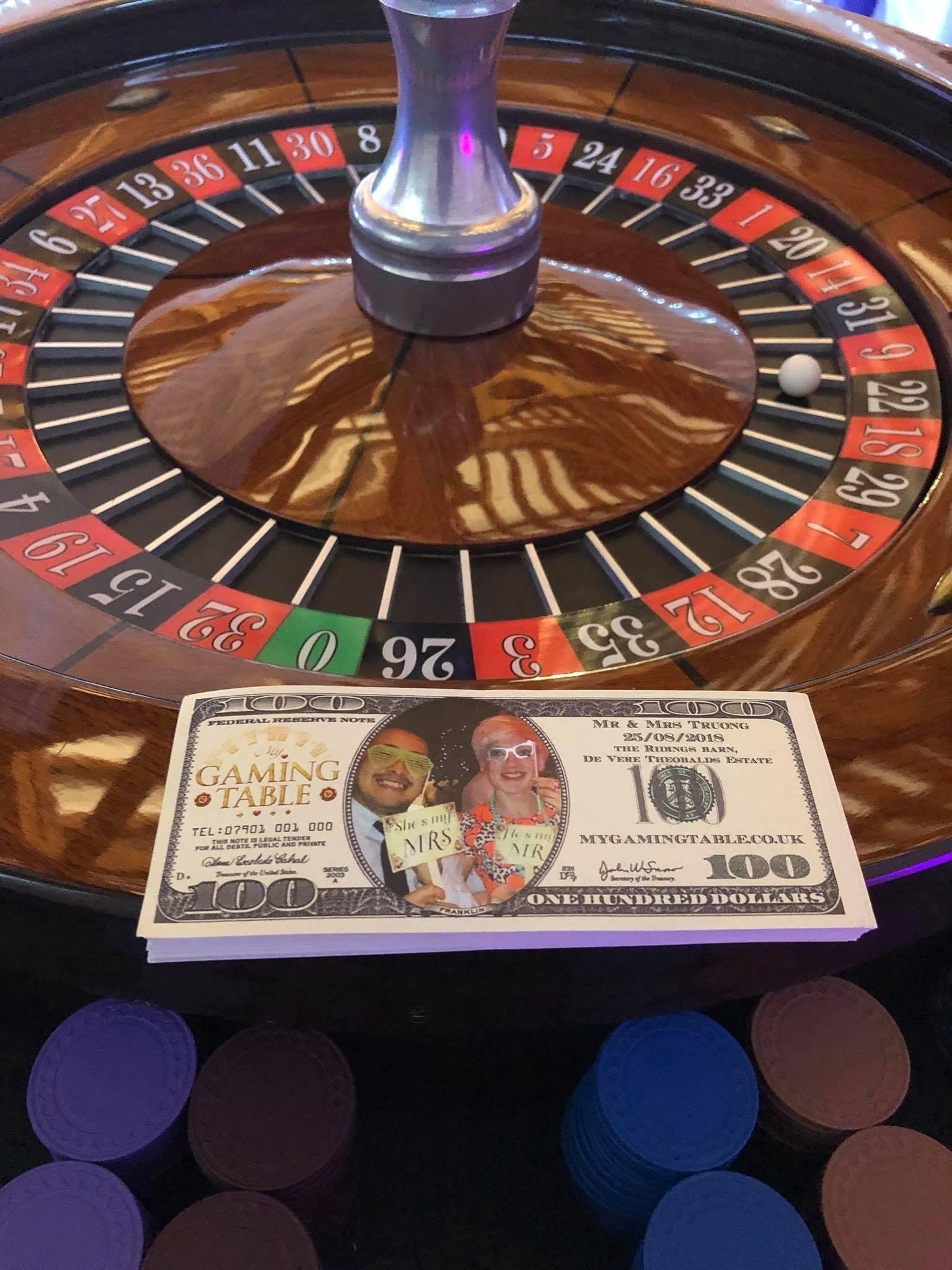 Complimentary Vegas backdrops are supplied if requested. We can also personalise your fun money with a photo of the Bride and Groom. As well as being fun this is a lovely memory and keepsake for your guests to treasure.